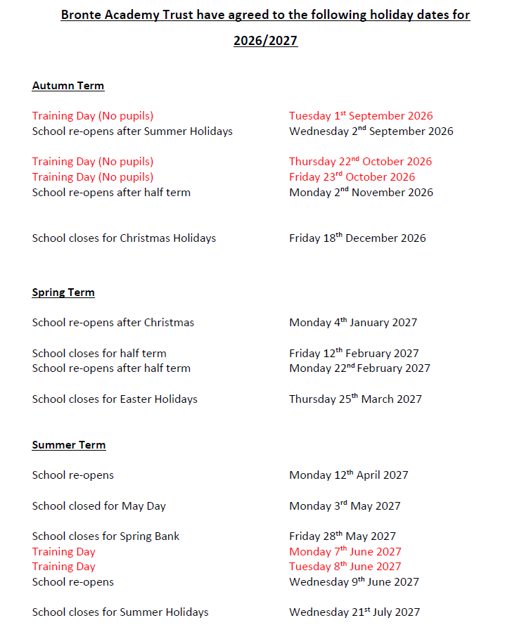 Below you can access the School’s term dates. We politely ask that parents check these before booking any holidays, please note that holidays during term-time will not be authorised.